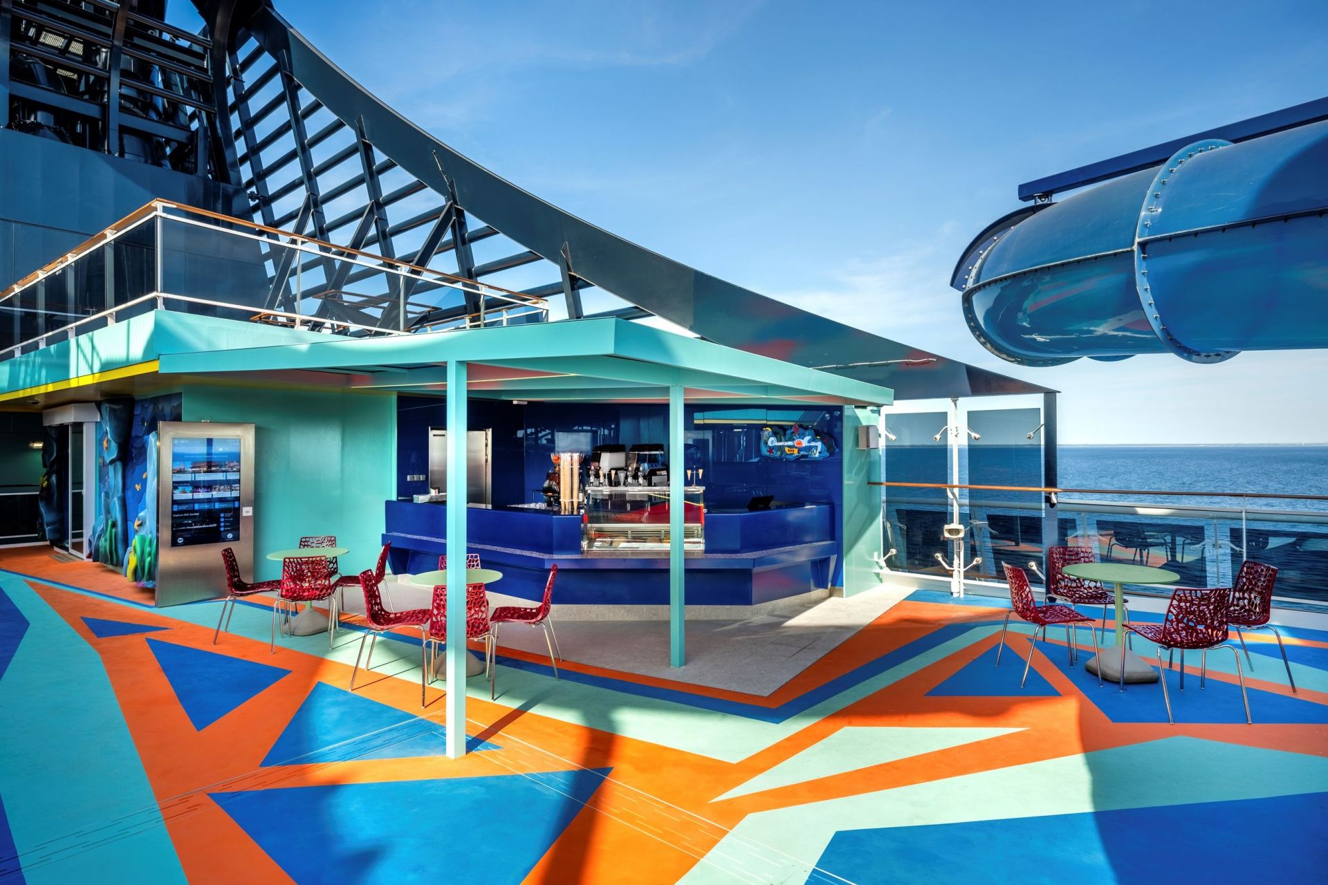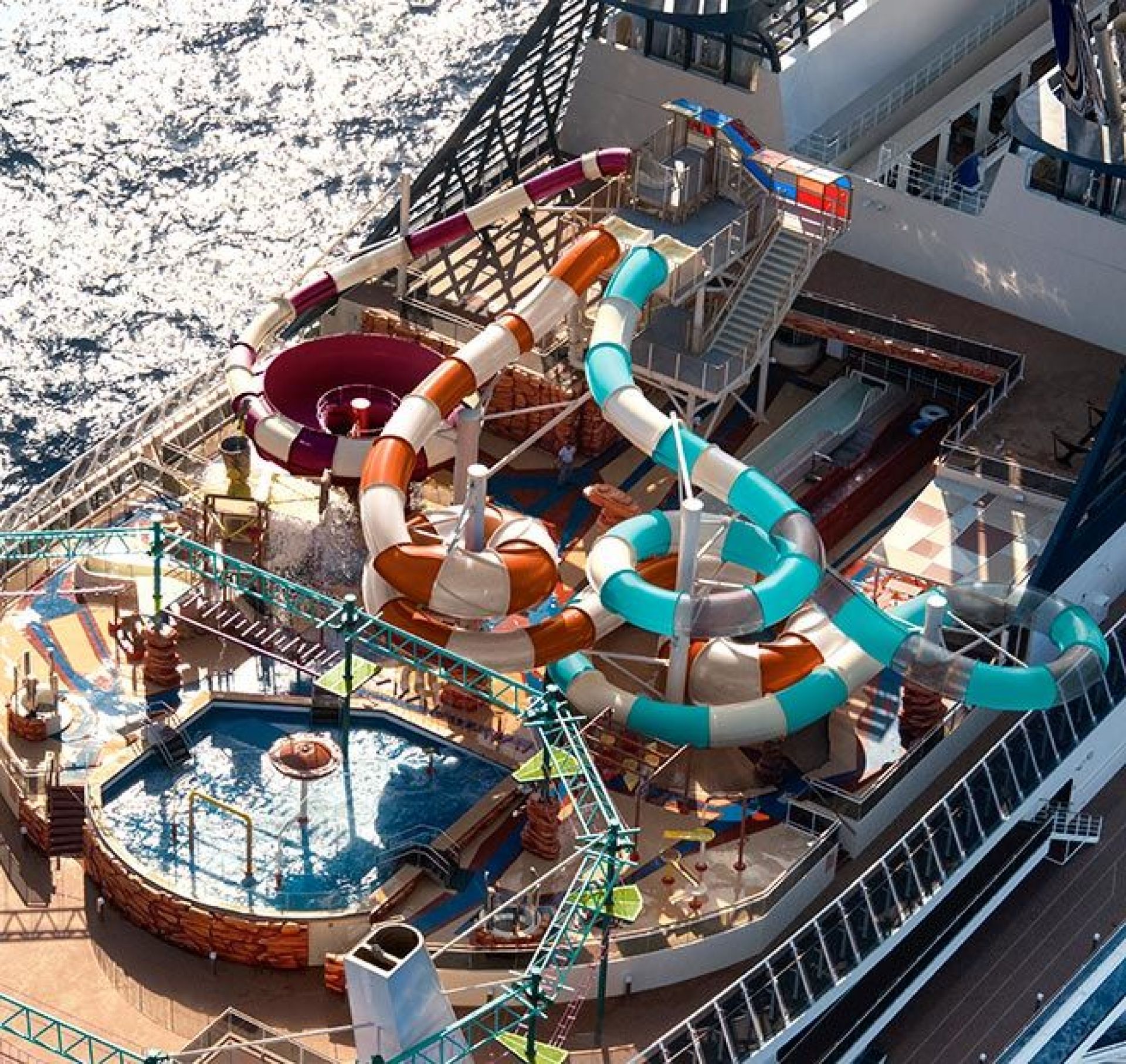 4 басейна и аквапарк с водни пързалки и голяма плажна зона с шезлонги около тях на откритите палуби, фитнес с уреди от Technogym, спортна зона с игрище за баскетбол, волейбол, фитнес и тенис, симулатор на Формула 1.