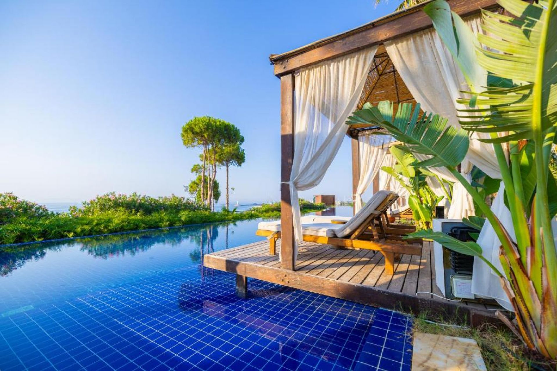Собствен,, пясъчен сдължина 100 м. и платформа, на която е разположен Mocha Beach Club с кабани (срещу заплащане). Чадъри, шезлонги и плажни кърпи на плажа и при басейна -безплатно.