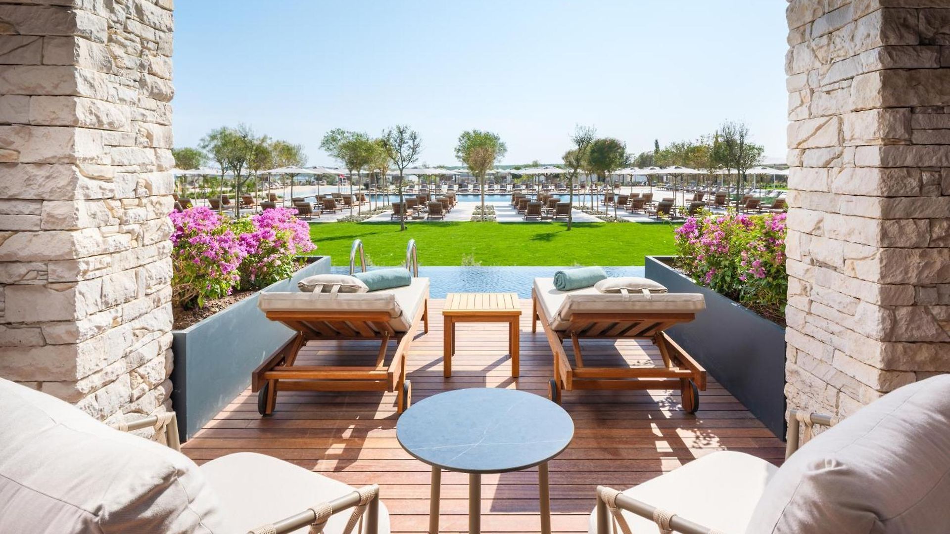 Собствен, пясъчен и платформа. Чадъри, шезлонги и матраци на плажа и при басейна - безплатно. Плажни кърпи - безплатно.