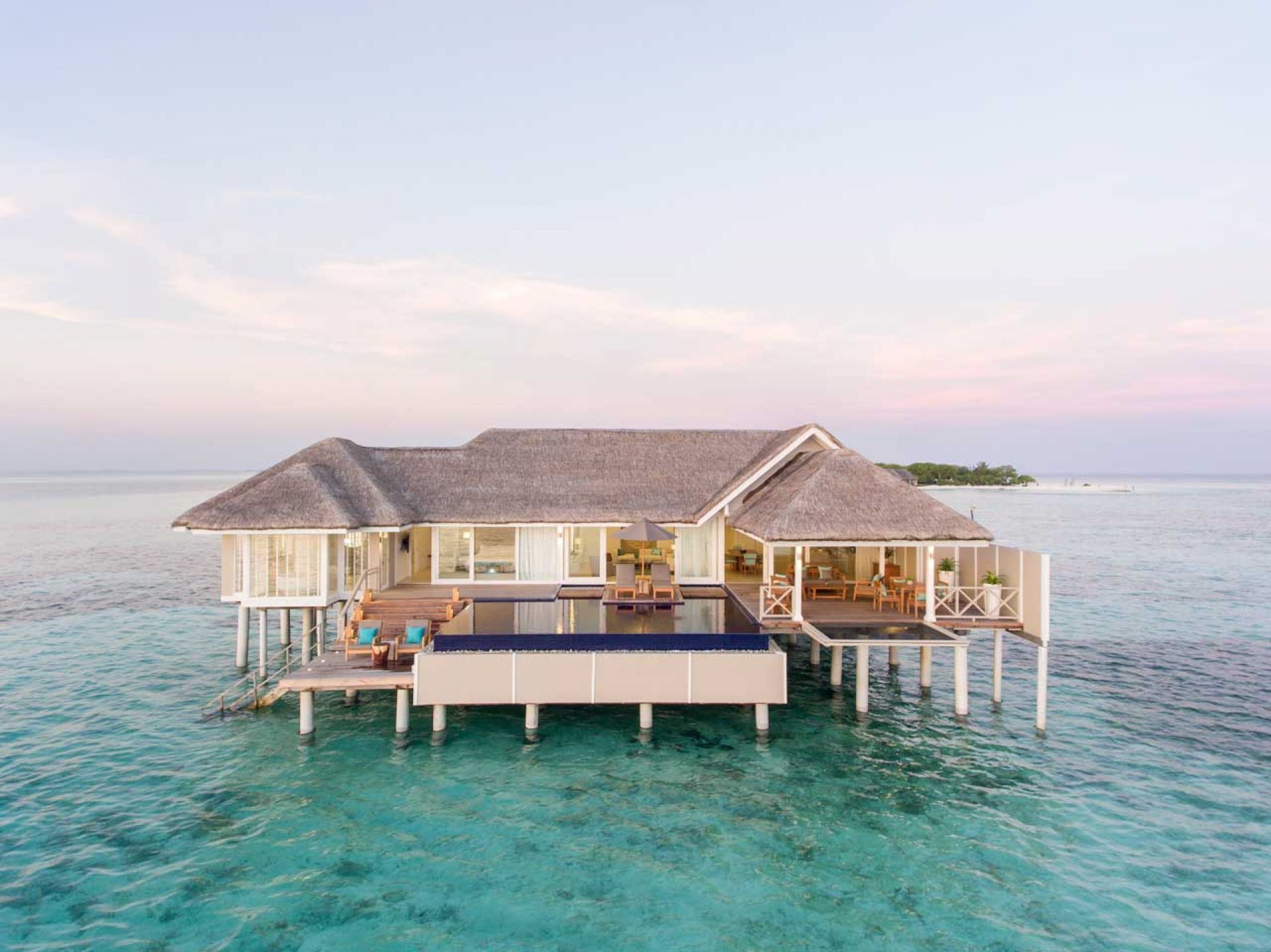 - 3 Temptation Pool Water Villa (220 кв.м.) - водни вили с басейн (14 м) с изглед към зората. Състои се от хол, спалня с кръгло легло, баня с отделна баня и душ, тераси с басейн, шезлонги, люлки, кът за сядане, кът за хранене и спускане във водата. Максимално настаняване - 2 възрастни + 1 дете (0-17 години).