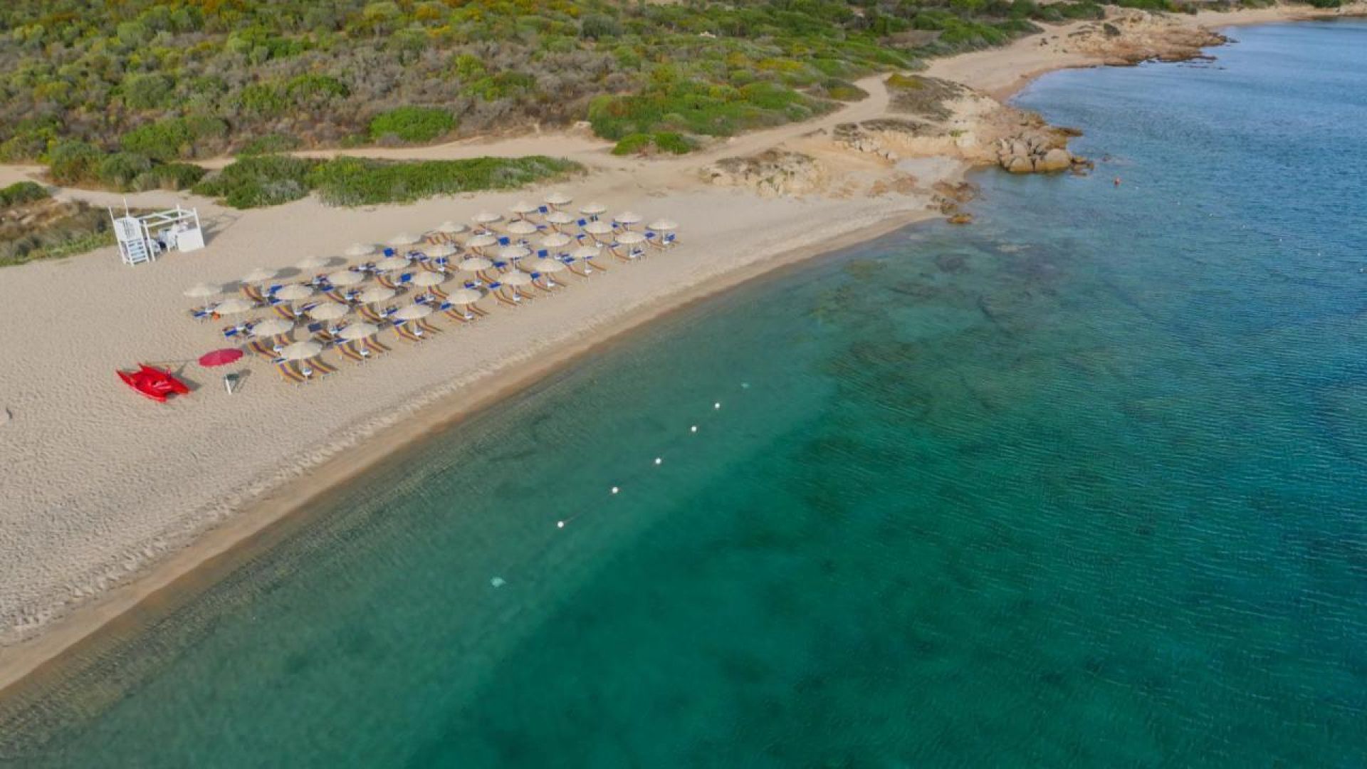 Чадър и два шезлонга по избор, при поискване с доплащане и в зависимост от наличността на "White Beach" с фин пясък и полегато море на около 600 м от хотела по черен път (проходим само пеша)