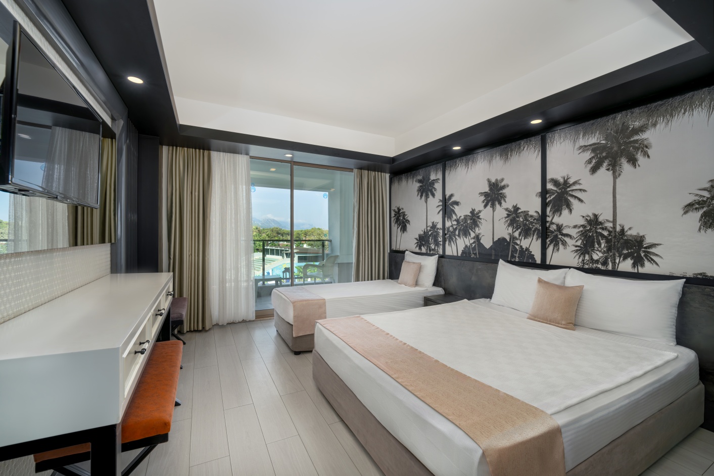 60 Garden Block Standard Room (изглед градина - 26 м2), 275 Standard Room (изглед градина, планина или страничен изглед море - 22 м2), 50 Standard Bunkbed Room (1 спалня и 2-етажно легло, изглед градина или планина - 26 м2), 3 Disabled Rooms (стаи за инвалиди, на първи етаж в основната сграда, гледка градина или планина - 22 м2), 32 Family Room (2 стаи със свързваща врата, 1 спалня и двуетажно легло, гледка градина - 33 м2), 10 Love Suit (спалня, тераса с джакузи, изглед басейн или частично море - 22 м2), 16 Swim -Up Room (спалня, тераса с директен достъп до общ басейн - 26 м2).