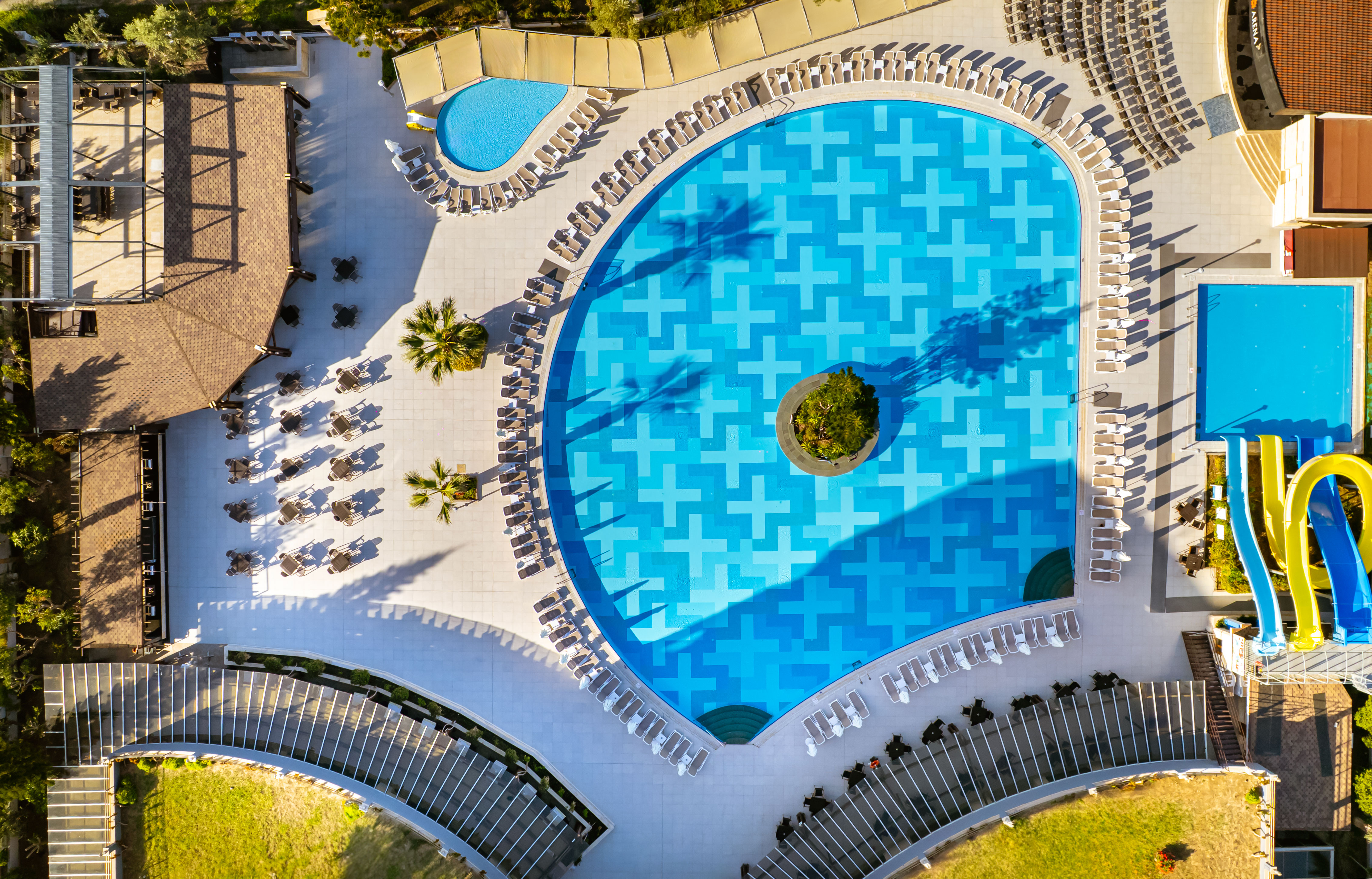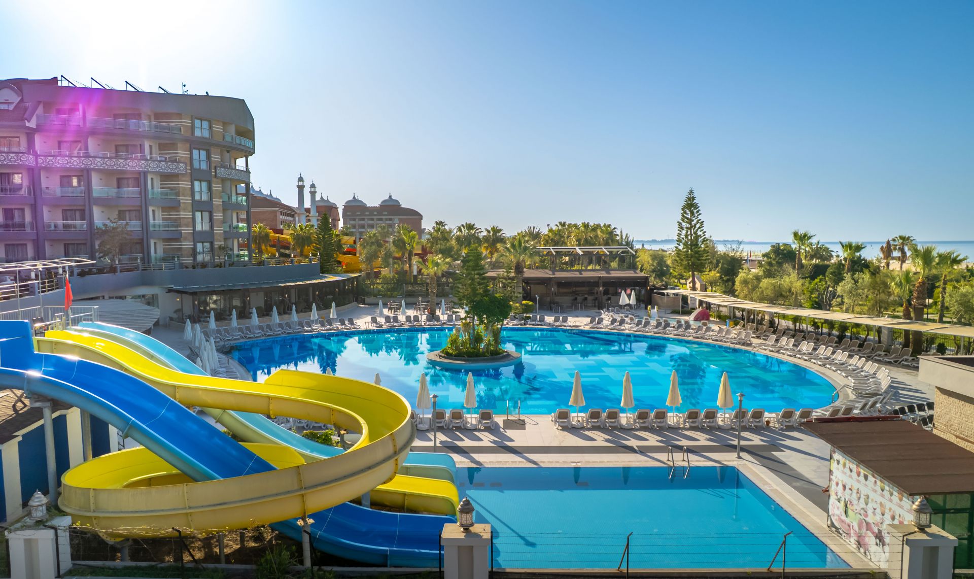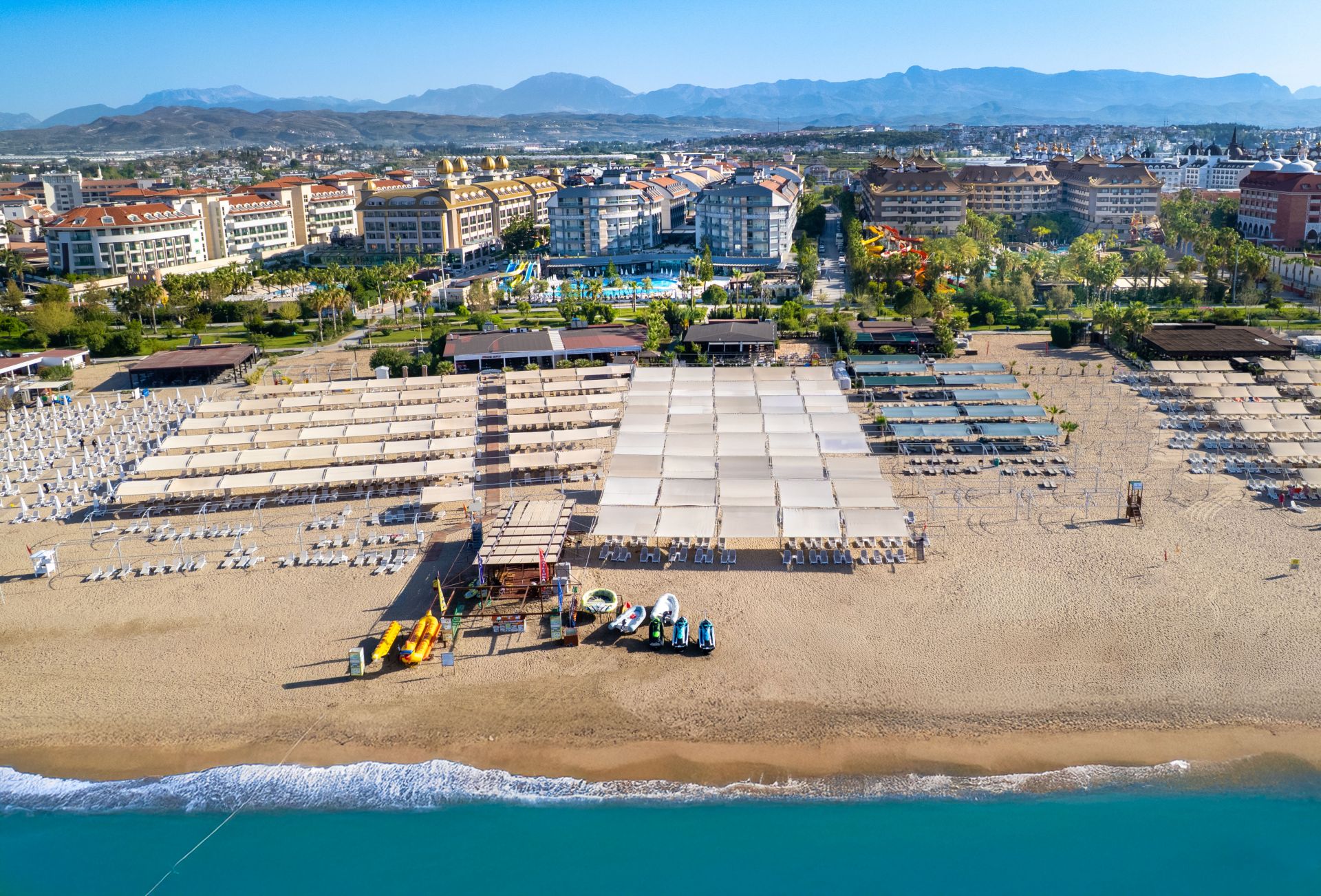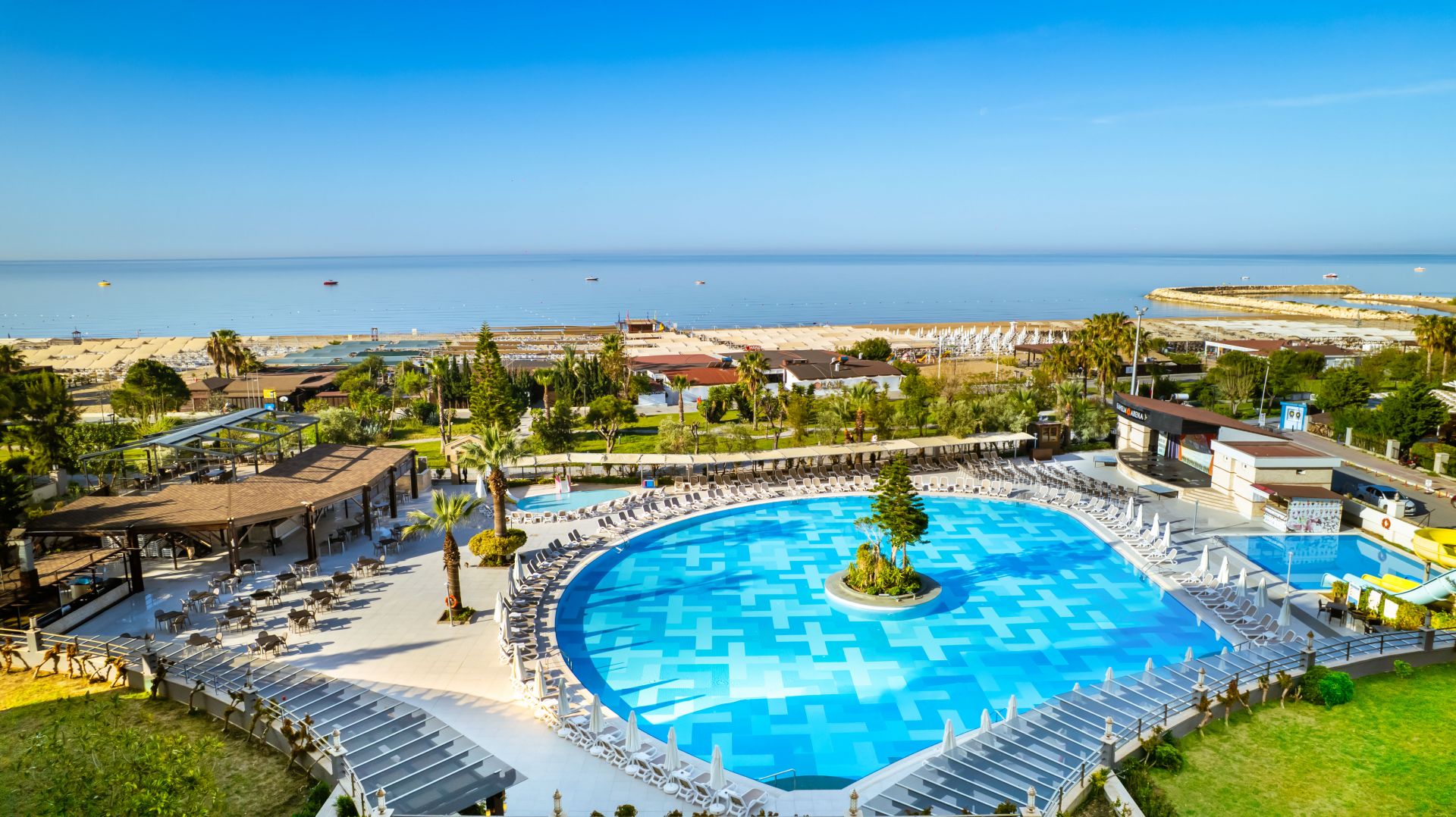 Основен ресторант, 4 а - ла - карт ресторанта (рибен, турски, италиански и китайски, с предварителна резервация, за едноседмичен престой - едно безплатно посещение на един ресторант), сладкарница, 6 бара, 2 открити и 1 закрит басейн, водни пързалки, амфитеатър, дискотека, мини маркет, 4 конферентни зали. За децата: 2 детски басейна – открит и закрит, мини клуб (4-12 г.), тийни клуб (11-15г.) – 6 дни в седмицата, детска анимация, лунапарк. Безплатни услуги: Сауна, турска баня, аеробика, дартс, тенис на маса, степ, боча, плажен волейбол, анимация, Wi-Fi (в лоби). Платени услуги: Масаж, Спа център, лекар, фризьор, рент-а-кар, химическо чистене, боулинг, билярд, интернет, електронни игри, водни спортове, фрешове на плажа. Плаж: Собствен - пясъчен, удостоен със сертификат „Син флаг”. Чадъри, шезлмонги, матраци и плажни кърпи на плажа и при басейните - безплатно.