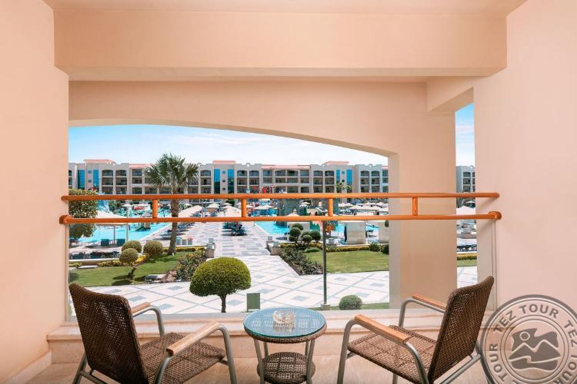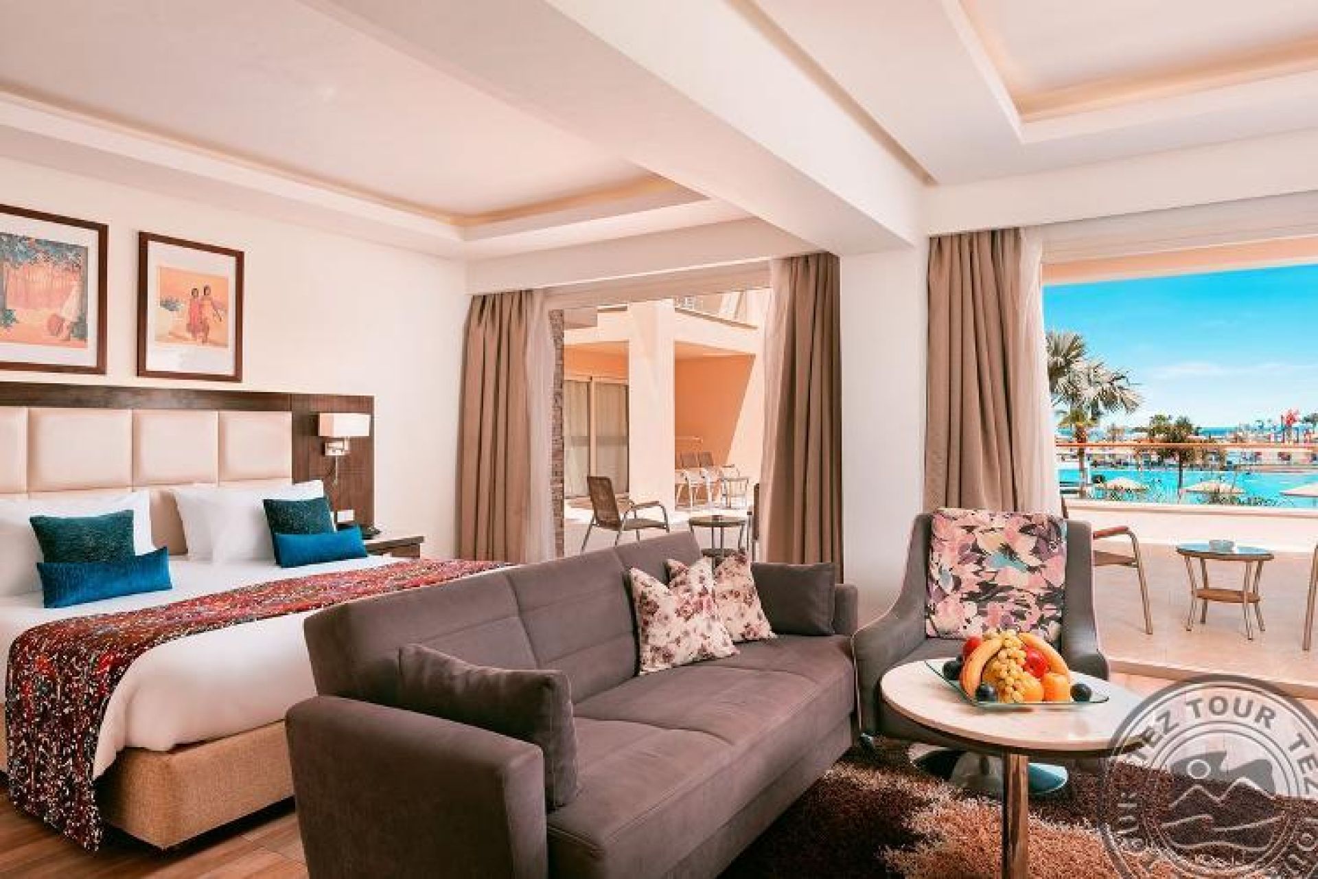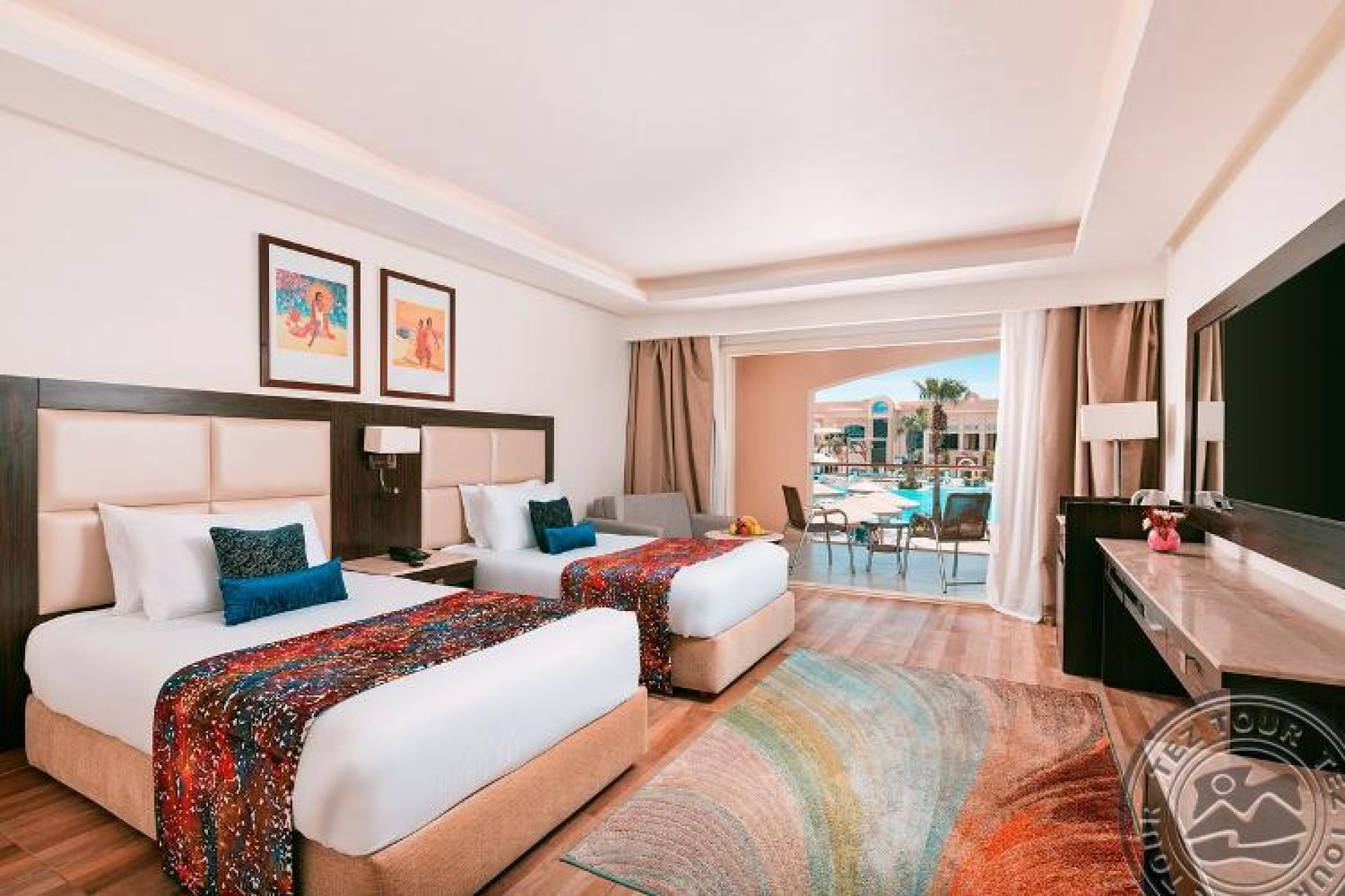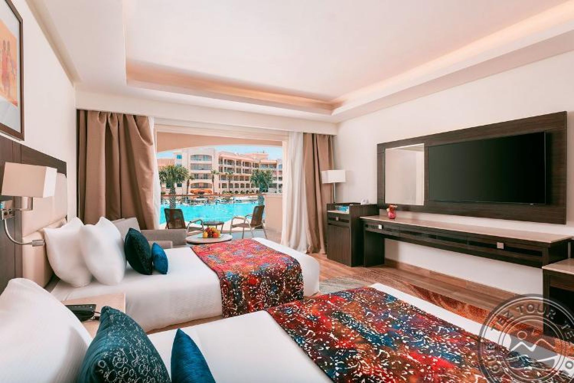 Делукс изглед към басейна (40 м2, спалня с двойно легло Queen или две единични легла, включително баня и балкон/тераса). Само едно допълнително легло.