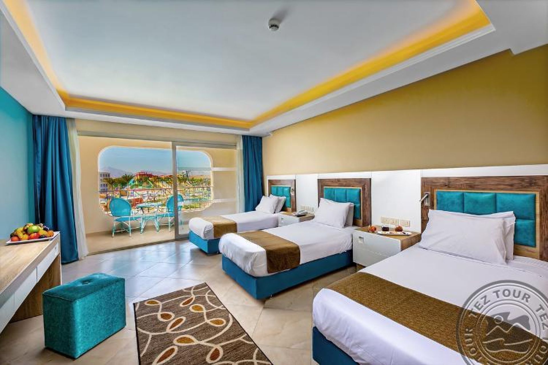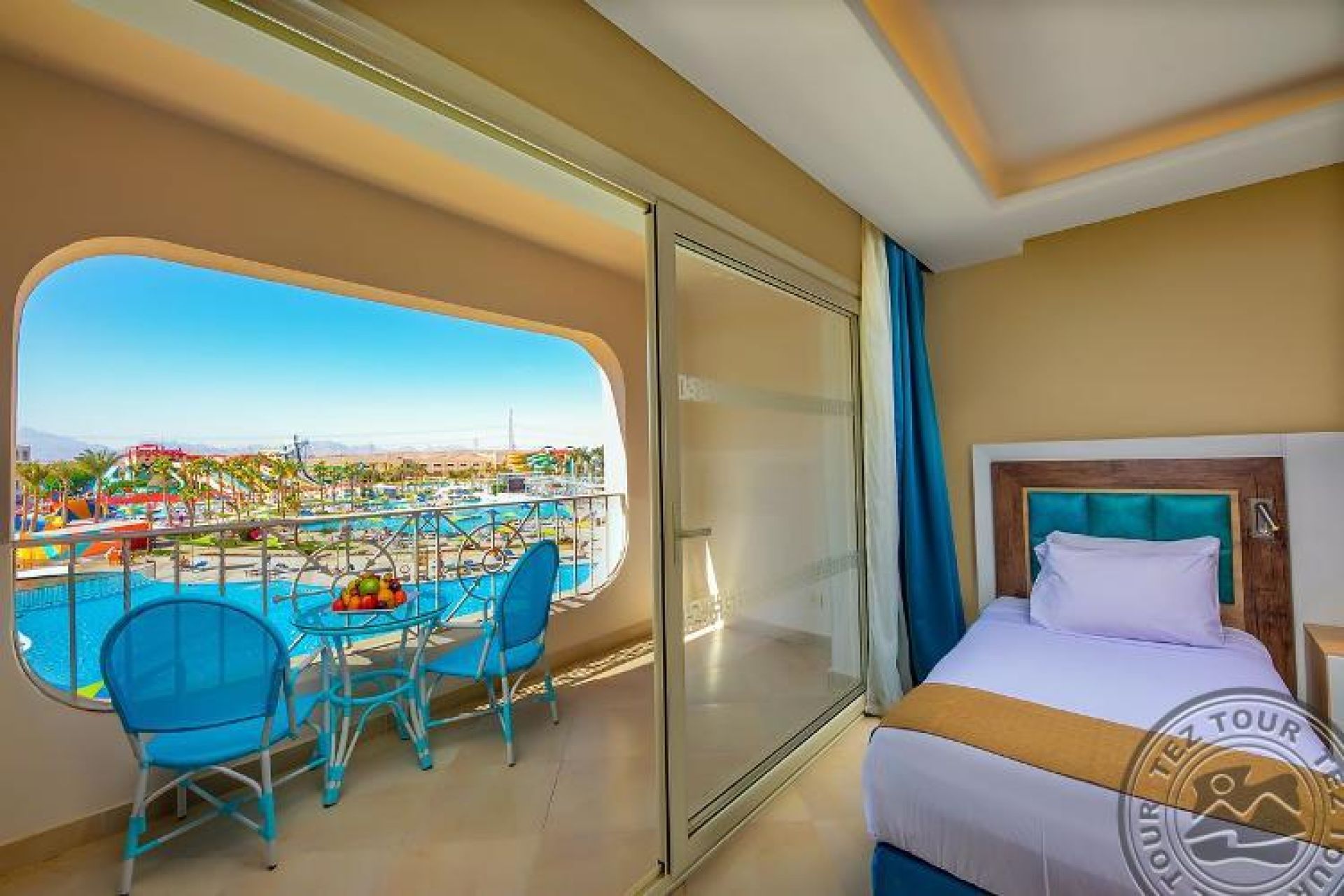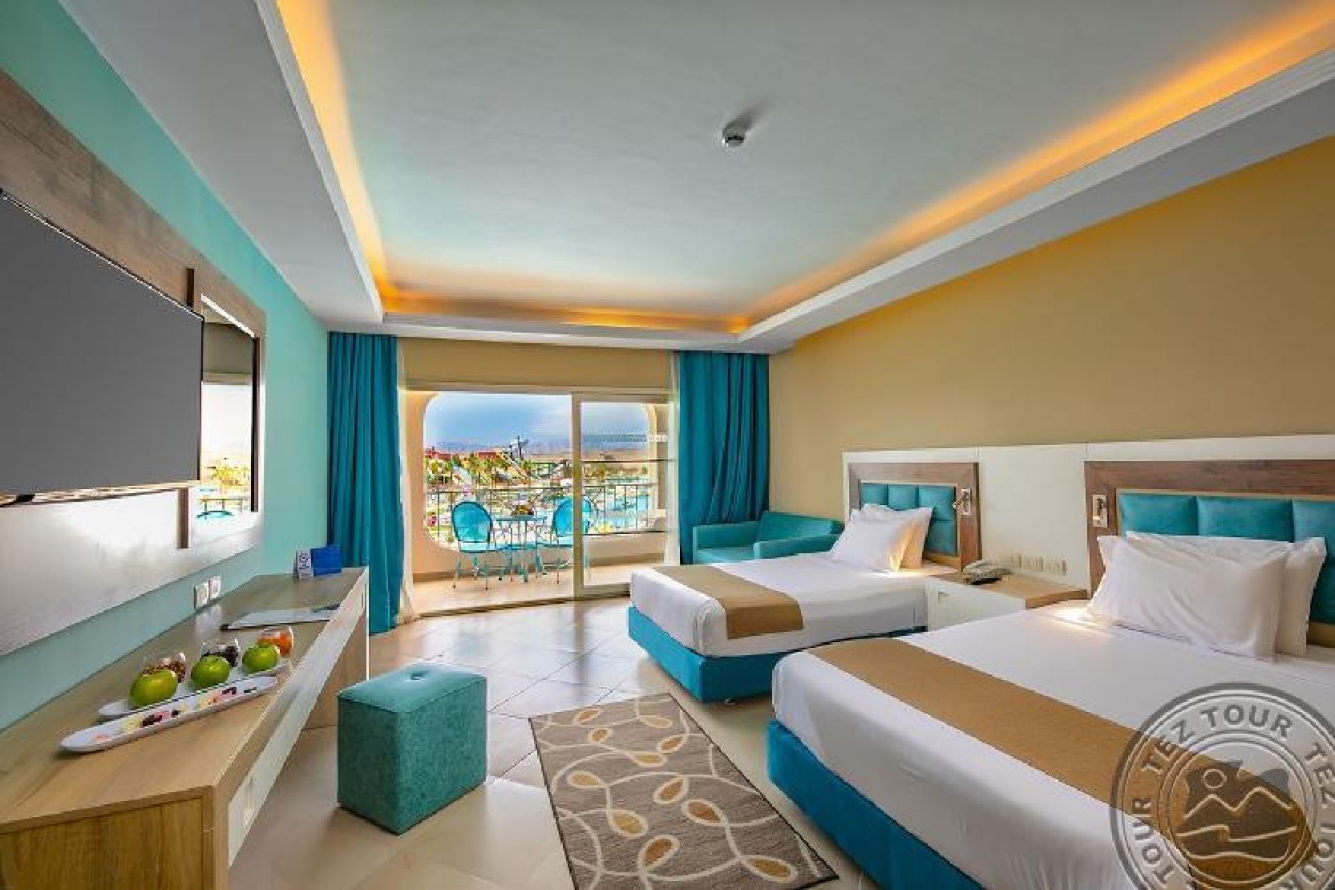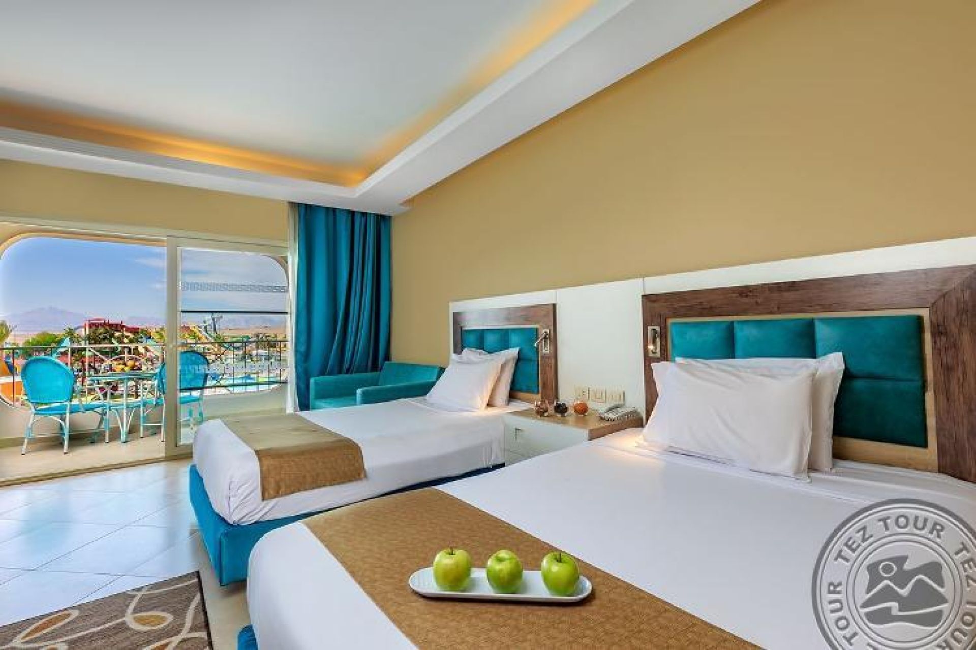 Family room (Pool/Aqua Park view, 50 м2 включително две спални (с врата) баня и балкон/тераса), 2 единични легла и 1 голямо двойно легло.