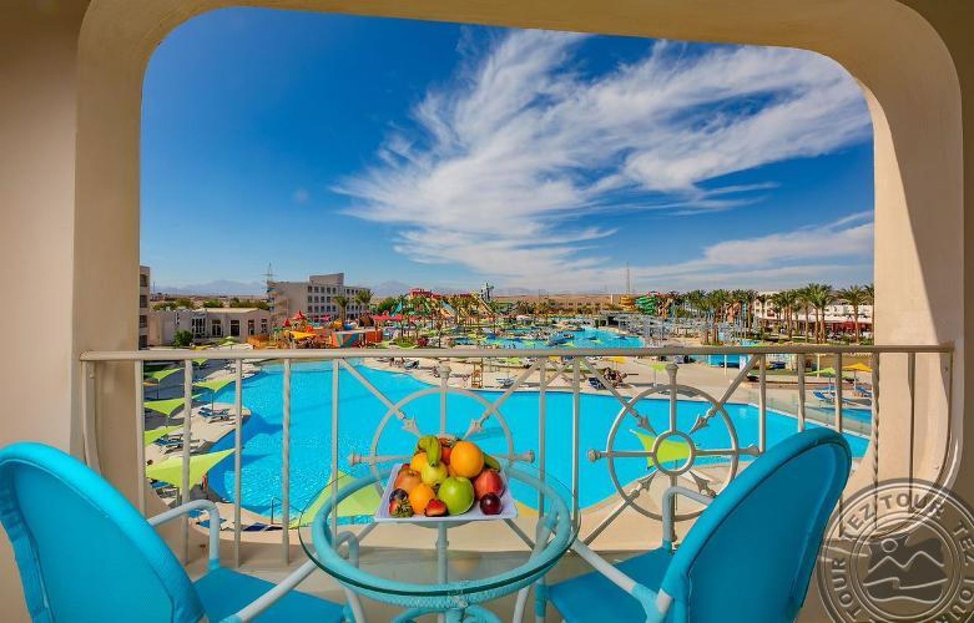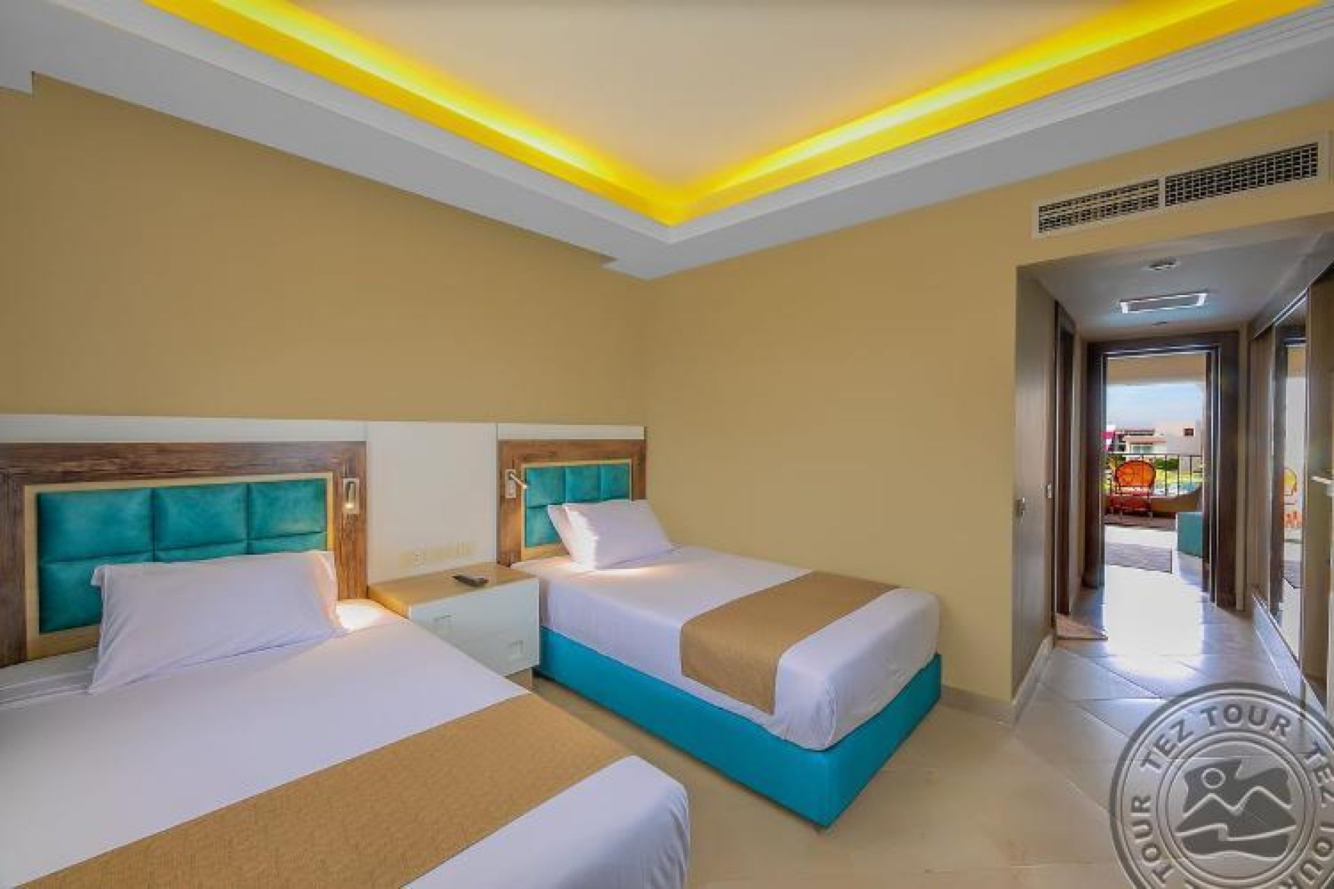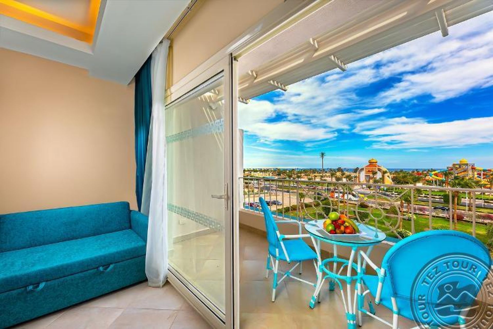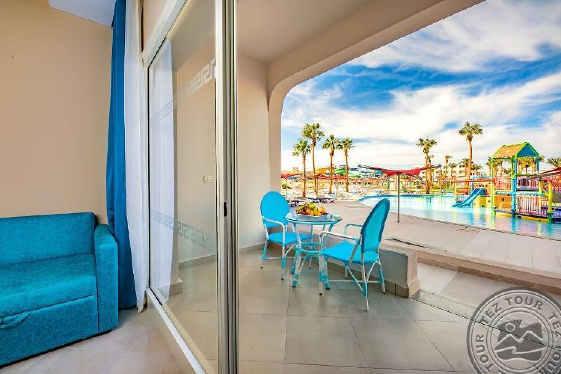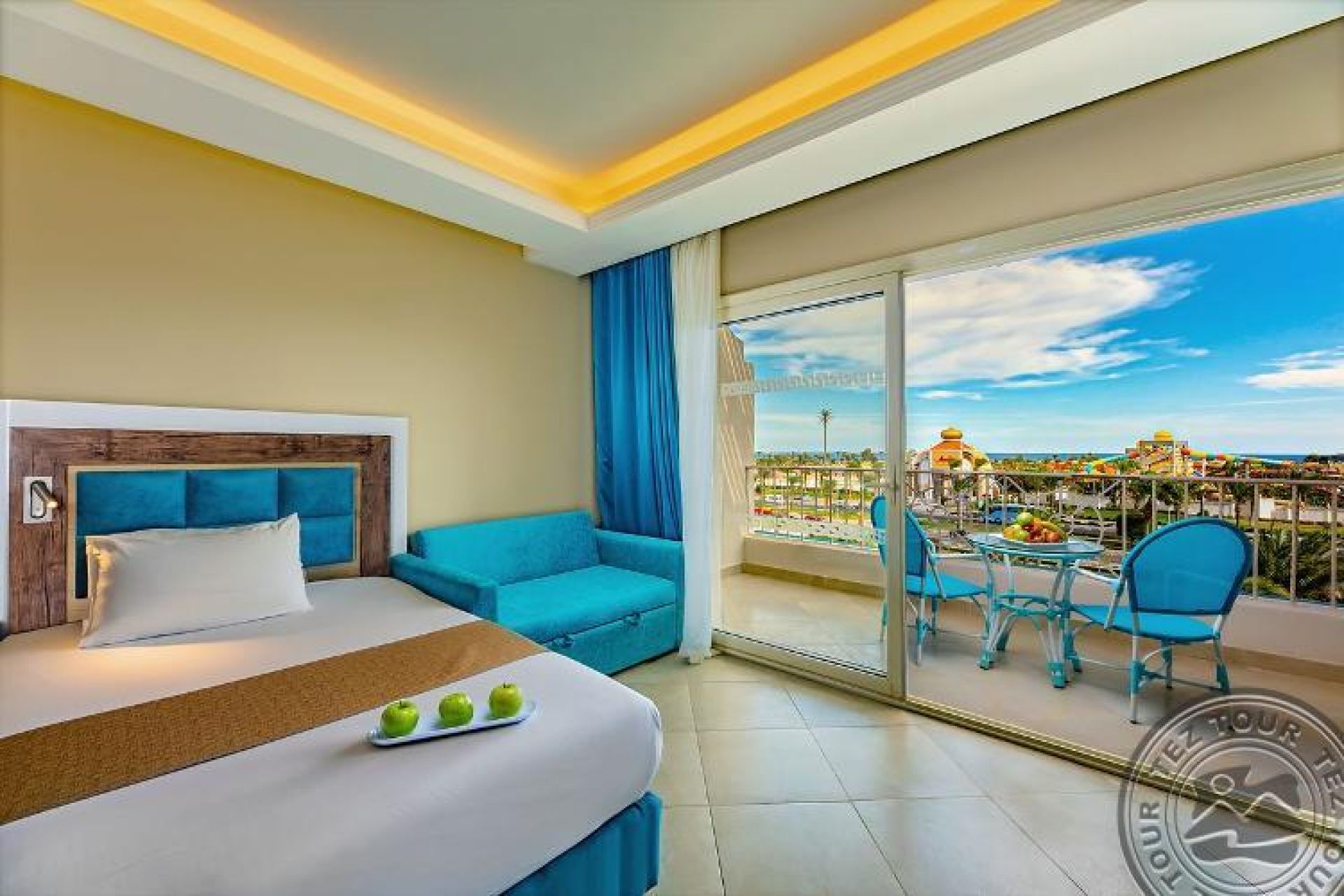 Family room (Pool/Aqua Park view, 50 м2 включително две спални (с врата) баня и балкон/тераса), 2 единични легла и 1 голямо двойно легло.