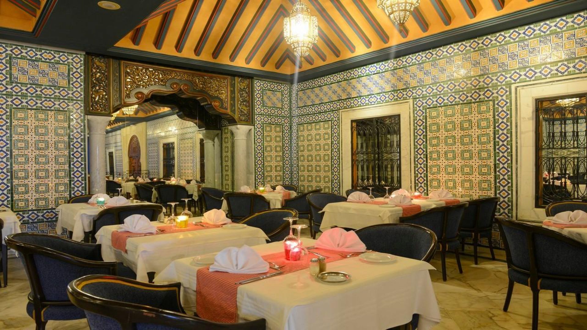 Хотелът разполага с 3 ресторанта - основен ресторант "The Blue", ресторант "El Sayadine", ресторант "La Carte Spices and Delights" - тунизийска кухня (1 безплатно посещение с резервация 24 часа предварително)