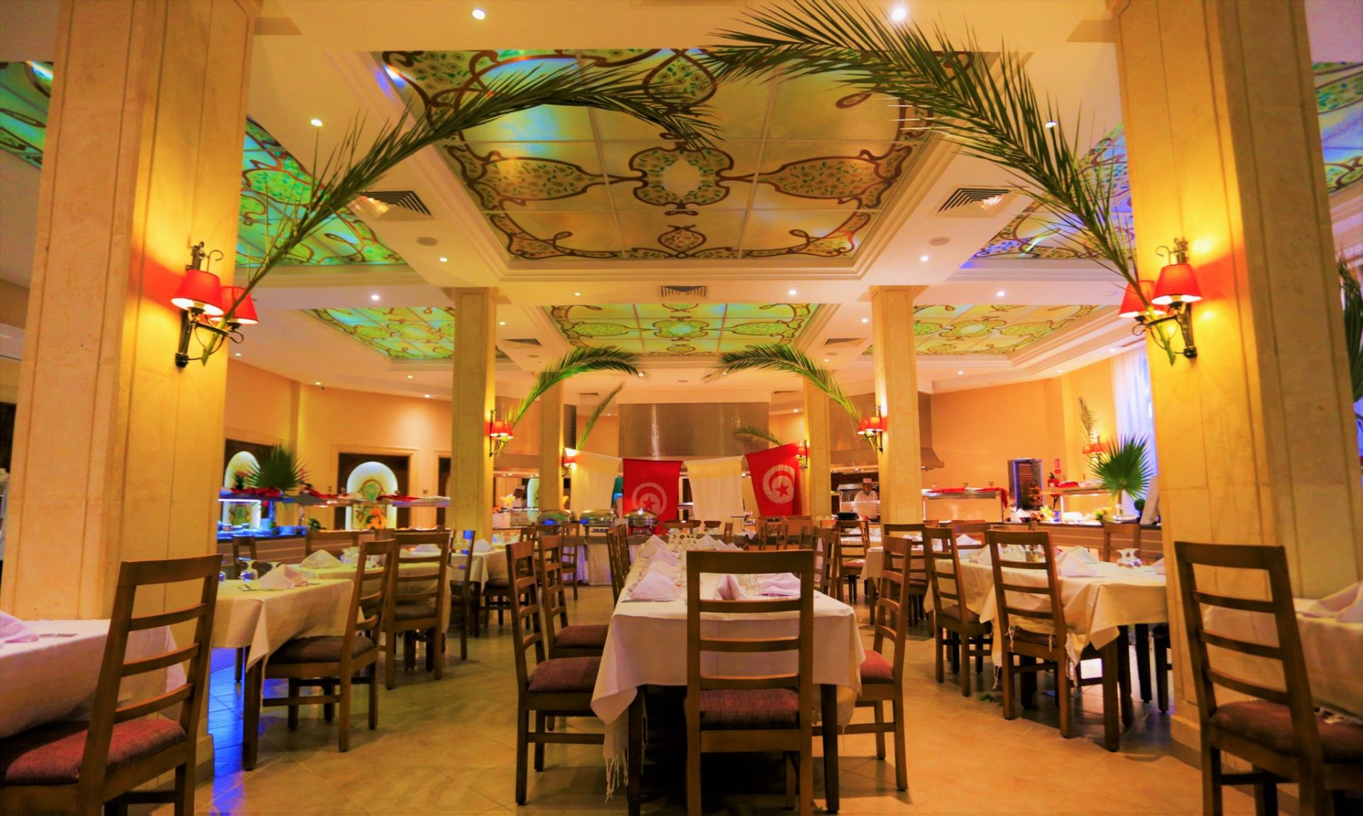 Основен ресторант Zeus, лоби бар Horus, бар на плажа, барбекю ресторант Sindbad (късна закуска, обяд, дневни закуски), мавританско кафене Isis Cafe Maure (наргиле-срещу заплащане), открит басейн, закрит басейн (отворен през април и октомври), СПА център, денонощна рецепция, обменно бюро, магазин за сувенири, 3 тенис корта.