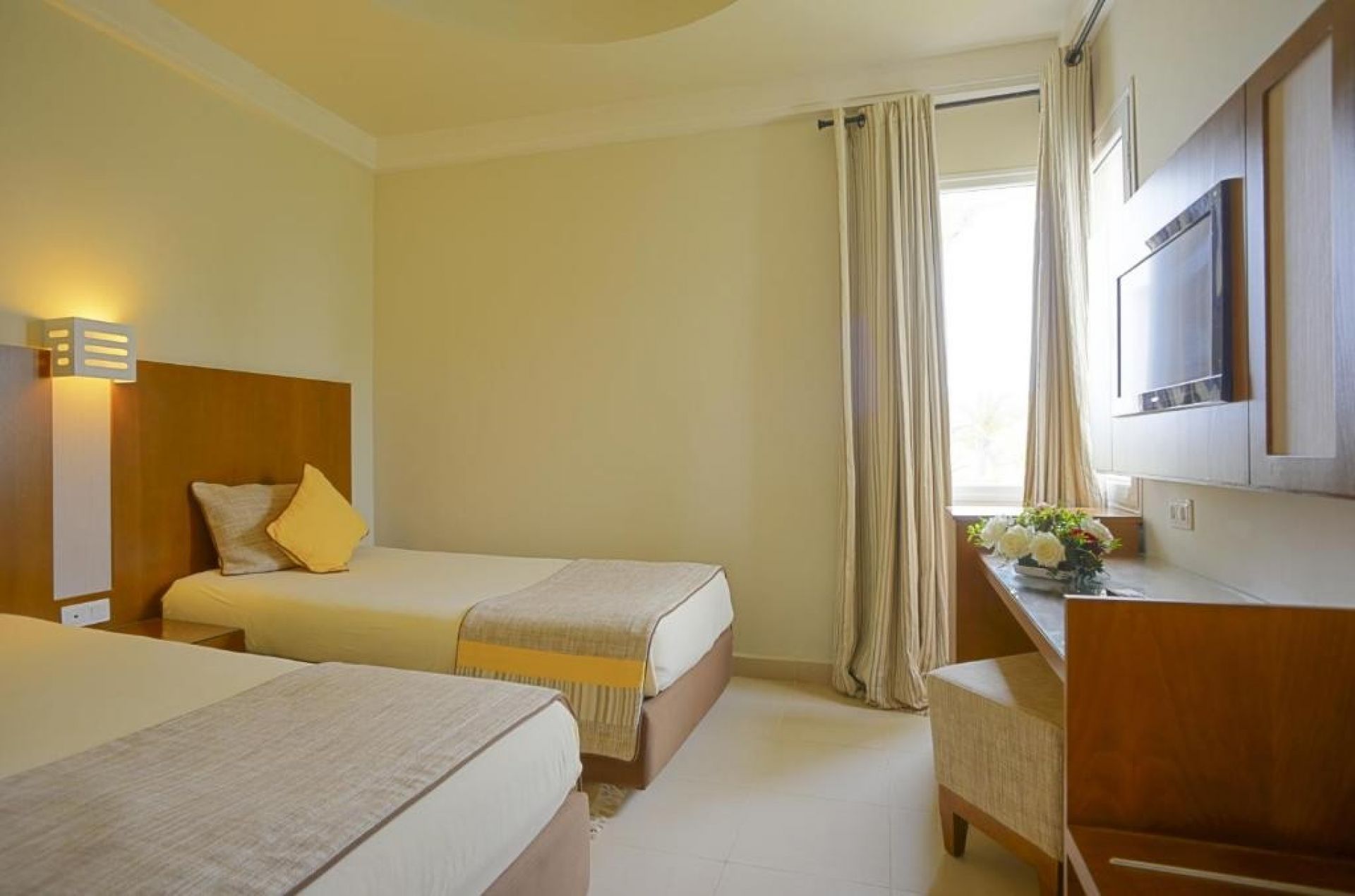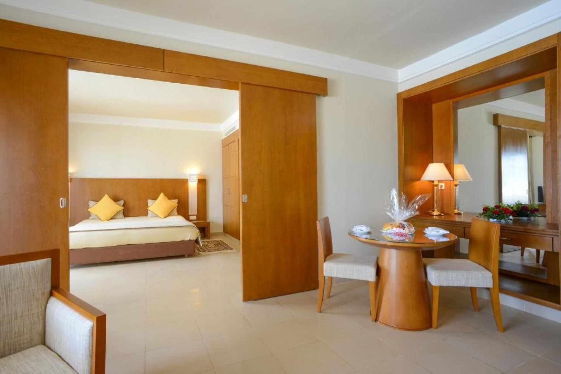 Menzel Family Room - Комфортно обзаведена и просторна с изглед към басейна или морето, семейната стая Менцел (42 м2) разполага с 2 отделни спални с плъзгаща се врата с капацитет за 4 души, баня и тоалетна, което я прави идеална за семейства или възрастни, които ценят комфорта и пространството. Оборудвана е със сейф, сешоар, минибар, телефон с директно избиране, сателитна телевизия, тераса / балкон, климатик, отопление, пакет за добре дошли и отлично почистване.