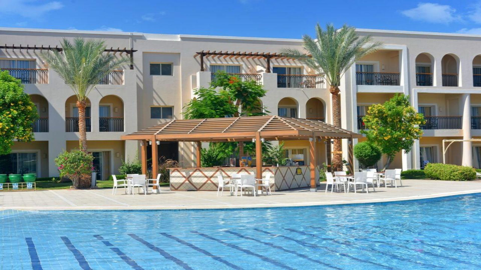 Басейнът към хотела е оформен стилно като числото осем точно в центъра на хотела. Отоплява се в периода ноември-април, а за децата има и отделен басейн. Хотелът разполага и с мини аквапарк с улеи, пързалки и спирала. Има 5 големи пързалки за големи и 1 пързалка за деца.